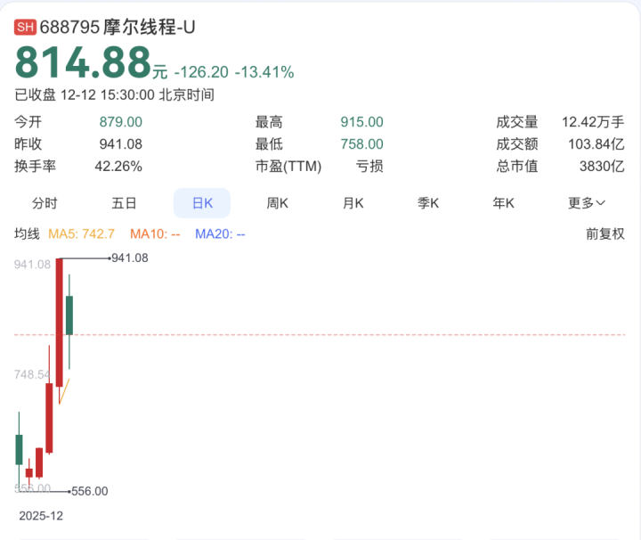 盘面上,摩尔线程上市以来股价大涨,最新股价报814.88元/股,较发行价大涨超600%,最新总市值为3830亿元。
